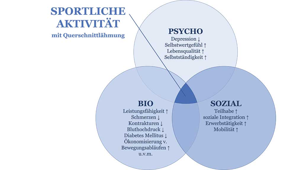 Während gemäß dem dritten Teilhabebericht der Bundesregierung etwa ein Drittel der Menschen ohne Beeinträchtigung keinen Sport treibt, liegt dieser Anteil bei Menschen mit einer Beeinträchtigung sogar bei über der Hälfte 1. Menschen mit einer Querschnittlähmung gehören dabei zu den inaktivsten Gruppen 2. Jedoch ist regelmäßige körperliche Aktivität insbesondere für diese Gruppe von essenzieller gesundheitlicher Bedeutung und zählt zu den wichtigsten Maßnahmen sowohl zur Rehabilitation querschnittspezifischer Beeinträchtigungen als auch zur Prävention lähmungsbedingter Folgeerkrankungen und Komplikationen 3 4 5. Ein Überblick über die Wirkung sportlicher Aktivität auf körperliche bzw. biologische, psychische und soziale Faktoren bei Menschen mit Querschnittlähmung wird anhand eines abgewandelten biopsychosozialen Modells in Abbildung 1 vermittelt. Studien zeigen, dass sportliche Aktivität signifikant die Leistungs- und Funktionsfähigkeit verbessert 6 7 8, was in einem positiven Zusammenhang mit mehreren Aspekten steht: