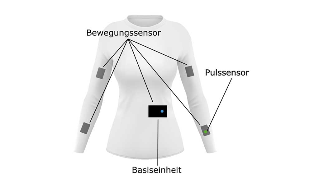 In Zusammenarbeit zwischen diesen Beteiligten soll bis Ende der Projektlaufzeit im Februar 2023 ein auf aktuellen wissenschaftlichen Erkenntnissen basierender erster Demonstrator (d. h. ein Prototyp) einer sensorgestützten Trainings-App entstehen. Diese soll ein individuelles Sportprogramm explizit für Menschen mit Paraplegie anbieten, das durch das Tragen eines mit Sensoren besetzten Funktionsshirts (Abb. 2) unterstützt wird. Zweck dieses sogenannten Sensorshirts ist es, Informationen zur Bewegungsausführung und ‑qualität sowie Pulsdaten an das Smartphone zu übertragen und in die App zu integrieren.