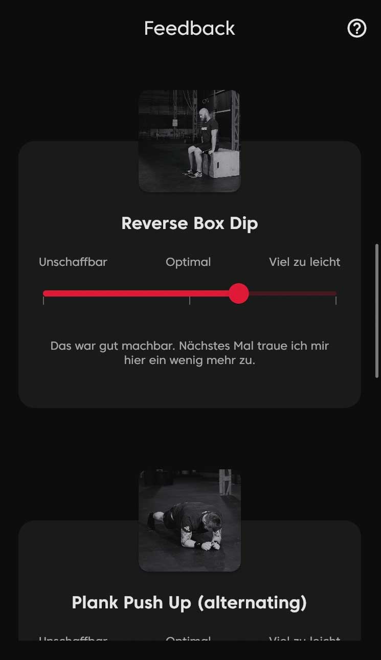 Um die Umsetzung der „ParaGym“-App nachvollziehen zu können, muss zunächst die Funktionsweise der „Kernwerk“®-App erläutert werden, auf der „ParaGym“ basiert. „Kernwerk“® bietet ein funktionelles Training nach dem „Daily-Workout-Prinzip“ an mit dem Ziel, eine möglichst universelle Fitness zu erreichen. Unter universeller Fitness ist eine Ganzkörperfitness in allen Kraftarten (Maximal- und Schnellkraft, Kraftausdauer) sowie motorischen Grundfähigkeiten (Kraft, Ausdauer, Beweglichkeit, Koordination, Schnelligkeit) zu verstehen. Das „Daily-Workout-Prinzip“ bedeutet, dass ein Team aus Trainerinnen und Trainern bzw. aus Sportwissenschaftlerinnen und Wissenschaftlern für jeden Tag ein Trainingsprogramm („Workout“) konzipiert, das zunächst für alle App-Nutzenden gleich ist. Dieses Workout wird anschließend mittels KI an die individuelle Leistungsfähigkeit, die im jeweiligen Moment zur Verfügung stehende Ausrüstung („Equipment“, z. B. Hanteln) sowie verschiedene Umgebungsvariablen (z. B. Platz zum Laufen) angepasst. Weiterhin lassen sich Übungen, die das Element „Springen“ beinhalten, oder Übungen, die das Element „auf dem Boden sitzen“ beinhalten, als Grundbedingungen ausschließen. Die Variablen „Equipment“, „Umgebung“ und „Grundbedingungen“ sind vor jedem Workout individuell einstellbar. Durch ein Feedback (Abb. 3) zum Schwierigkeitsgrad jeder Übung nach Abschluss eines Workouts erhält die KI Informationen zur persönlichen Leistungsfähigkeit der Nutzenden. Dadurch lernt die KI und passt so das „Daily Workout“ an die individuellen Stärken und Schwächen an.