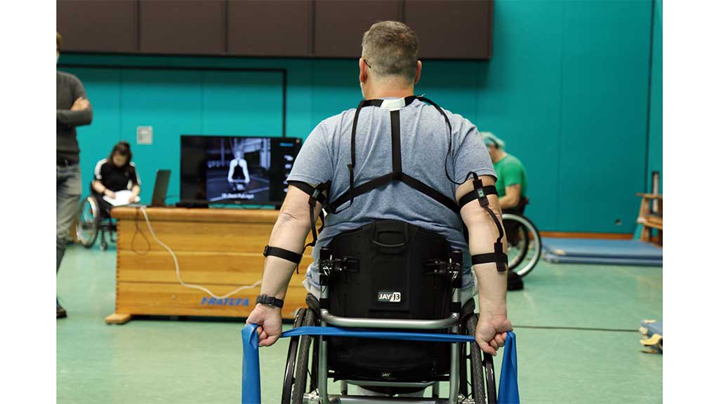 In einem nächsten Schritt wurden die Übungen, Übungsanleitungen und ‑videos sowie das Sensorgurtsystem als Prototyp des Sensorshirts im Rahmen spezieller „ParaGym“-Workshops (Abb. 5) einem ersten Praxistest unterzogen. Elf Teilnehmende mit paraplegischer Querschnittlähmung testeten die Durchführbarkeit des Übungskatalogs und bewerteten die Anleitung hinsichtlich ihrer Verständlichkeit sowie die Übungsvideos hinsichtlich ihrer Nützlichkeit. Die Teilnehmenden hatten die Möglichkeit, jede Übung durch eine persönliche Anmerkung bezüglich der erhobenen Aspekte zu ergänzen. Die Workshops wurden zudem fachlich durch drei anwesende Physiotherapeutinnen bzw. ‑therapeuten unterstützt, die aus ihrer Perspektive und anhand ihrer Beobachtungen die Übungen bewerteten. Dabei ergab sich, dass lediglich 6 der 56 Übungen nicht oder nur eingeschränkt durch führbar waren; Gründe hierfür waren in den meisten Fällen eine unzureichende muskuläre Ansteuerung und in wenigen Fällen Schmerzen oder andere Gründe.