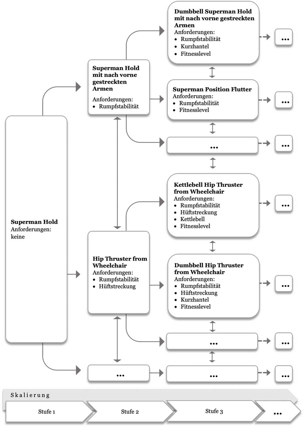 Nach geringfügiger Anpassung des Übungskataloges wurde dieser in das von dem Unternehmen Kernwerk entwickelte und zur Verfügung gestellte sogenannte „Admin Panel“ übertragen. Dies ist eine Online-Plattform, über die Übungen und Trainingseinheiten eingepflegt werden können, die anschließend für die Programmierung der „ParaGym“-App zur Verfügung stehen. Um eine Individualisierung des Workouts zu ermöglichen, wurden die Übungen mit bestimmten Merkmalen körperlicher Voraussetzungen belegt. So ist für die Übung „Reverse Dips from Box/Wheelchair (in Front of Wheelchair)“ (rückwärtiger Beugestütz vor dem Rollstuhl) (Abb. 4) die Voraussetzung „eingeschränkte Rumpfstabilität“ festgelegt. Hat eine Nutzerin bzw. ein Nutzer zuvor ausgewählt, dass alle Übungen ausgeschlossen werden sollen, die eine „eingeschränkte Rumpfstabilität“ erfordern, so wird für die oben genannte Übung automatisch die Alternativübung „Reverse Dips from Box/Wheelchair (in Wheelchair)“ (rückwärtiger Beugestütz im Rollstuhl) (Abb. 6) angezeigt. Auf diese Weise entsteht ein „Übungsbaum“, der sich umso weiter verzweigt, je höher die Leistungsfähigkeit, je größer der Anteil innervierter Muskulatur und je größer die Equipment-Auswahl ist (Abb. 7). Dieser bildet die Grundlage für die Konzeption der Trainingseinheiten.