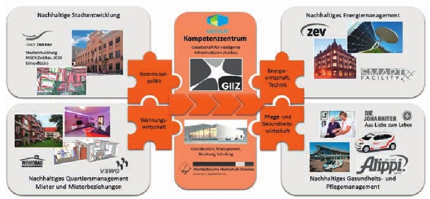 In Zwickau wurden und werden bisher auch einige solcher Projekte erfolgreich durchgeführt (siehe Kasten). Mit diesen Projekten ist es gelungen, ein Netzwerk zu etablieren, das sich intensiv mit der Weiterentwicklung und Umsetzung smarter Quartiere beschäftigt (Abb. 2). Bereits im Jahr 2011 konnte die Gesellschaft für intelligente Infrastruktur Zwickau mbH (GIIZ) gegründet werden. Die GIIZ als Zusammenschluss von Unternehmen unterschiedlicher Branchen, insbesondere aus der Wohnungs- und Energiewirtschaft, forciert gemeinsam mit der Westsächsischen Hochschule Zwickau die integrierte Entwicklung von Lösungen für das Wohnen und Leben in der Zukunft. Zur Erreichung dieser Ziele und zur Einbindung weiterer Partner entstand 2017 das Transfer- und Kompetenzzentrum „ubineum“ in Zwickau (Abb. 3).