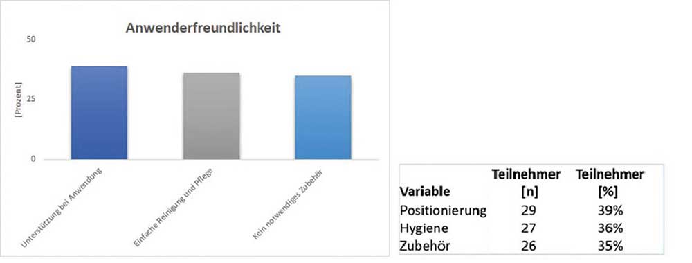 In der dritten Kategorie wurden die Anforderungen an die Anwenderfreundlichkeit evaluiert (Abb. 3). Hierbei wurden keine Unterschiede bezüglich der Wichtigkeit der drei erfragten Unterkategorien „Positionierung“, „Reinigung/Hygiene“ und „Zubehör“ ermittelt. Die Ergebnisse zeigen den Wunsch nach einer Unterstützung bei einer korrekten Anlage und Positionierung der Orthese bei 39 % der Befragten. Zudem wünschen sich 36 % eine Orthese, die leicht und unkompliziert zu reinigen ist und deren Instandhaltung keines großen Aufwands bedarf. Weiterhin legten 35 % der Befragten Wert darauf, dass keine Zubehörteile für eine korrekte Anwendung und Justierung notwendig sind.