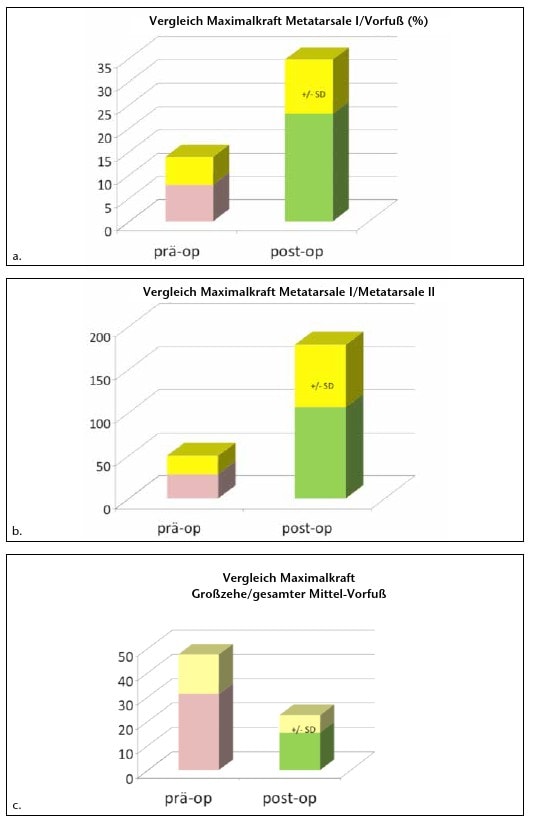 Die quantitativen Ergebnisse der pedographischen Analyse zeigen Tabelle 1 und Abbildung 3. Die am Metatarsale I gemessene Maximalkraft während der Schrittabwicklung nahm um mehr als das Dreifache des Ausgangswertes zu und lag postoperativ über der am Metatarsale II gemessenen. Das Metatarsale I war damit fast zu einem Viertel an der Kraftübertragung des Mittel-Vorfuß-Ab-Vergleich Maximalkraft schnittes beteiligt, was etwa der physio-Großzehe/gesamter Mittel-Vorfuß logischen Verteilung entspricht. Die Maximalkraft der Großzehe in Relation zur gesamten Mittel-Vorfuß-Belastung zeigte sich nach dem Flexor-hallucis-longus-Transfer relativ etwa halbiert gegenüber dem präoperativen Zustand; absolut blieben jedoch 82,6 % der Ausgangs-Maximalkraft erhalten. Bei allen Werten sind allerdings die wachstumsbedingten Veränderungen mitzuberücksichtigen.
