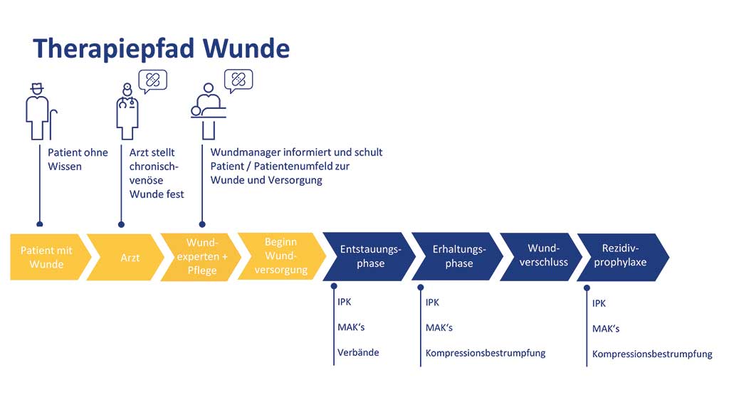 Und nicht zu vergessen, die Zusammenarbeit von allen Bereichen ist und bleibt zielführend: Ärzte, Wundzentren, Pflegepersonal, Physiotherapeuten, Sanitätshäuser/Orthopädietechniker, soziales Umfeld und natürlich die wichtigste Person, der Patient. Zielsetzung ist eine Wundtherapie angepasst auf jeden einzelnen Patienten und auch auf das soziale Umfeld mit anschließender Rezidivprophylaxe.