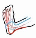 Der Fuß leistet einen sehr wichtigen Beitrag zum Verständnis des gesamten Halte- und Bewegungsapparates. Nach Tom Myers 1 beginnen alle großen Muskelfaszienverläufe am Fuß oder umgreifen ihn. So beginnt zum Beispiel die sogenannte oberflächliche Rückenlinie an den Zehen und verläuft vom Ballen über die Fußsohle, sodann über Ferse, Wade, Oberschenkelrückseite, Rücken und Nacken über den Kopf bis zu den Augenbrauen. Sie richtet den Körper auf. Die Spirallinie dagegen zieht sich spiralig um den Körper und umfasst die anderen anatomischen Muskelfaszienzüge am Fuß (Abb. 2). Es ist leicht vorstellbar, dass Veränderungen oder Störungen im Fuß nicht nur dort, sondern auch im Verlauf der Muskelfaszienzüge zu Beschwerden führen können. So ist aus der orthopädischen Praxis bekannt, dass durch falsche Belastung des Vorfußes nicht nur Metatarsalgien, sondern auch Rückenschmerzen auftreten können.