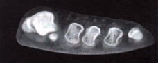 Testunterlagen wurden entsprechend den ermittelten Balligkeiten ausgeschliffen und das Verhalten des Fußes computertomografisch untersucht. Dabei zeigte sich: Bei balligem Untergrund dreht sich der mediale Strahl nach außen, und der Großzehenstrahl wird supiniert. Die Metatarsalköpfchen 2, 3 und 4 treten tiefer, und der Ballenbereich rundet sich aus. Dagegen steht beim planen Untergrund der mediale Strahl regelrecht proniert und das Großzehengrundgelenk in der Linie der Metatarsaliaköpfchen (Abb. 7a u. b). Als planer Untergrund wurde eine Platte aus gewelltem Federstahl von 0,26 mm Dicke über die Versuchsanordnung gelegt und belastet. Diese Platte ist in querer Richtung stabil, in Längsrichtung jedoch flexibel. Sie wurde für weitere Versuche in Einlagen und als Brandsohle in Schuhe eingebaut 5.