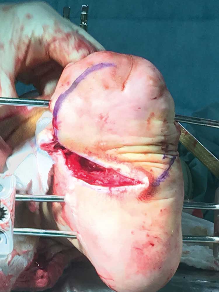 Es ist festzustellen, dass sowohl die Länge der V‑förmigen Schenkel als auch ein schmaler Winkel das Verschließen durch den Entlastungschnitt vereinfacht. Den Chirurgen kostet es zwar Überwindung, dass es größerer Schnitte bedarf, um einen kleinen Defekt des Fußes zu verschließen – dies ist nicht nur eine Sache des Verstandes, sondern der Emotion, die die Bewältigung des Alltags erschwert. Operationstechnisch betrachtet verhält es sich allerdings so, dass die Reduktion des V‑Winkels und die Verlängerung der Schenkelstrecke einen spannungsfreien Verschluss der Verschiebeplastik erlauben und so eine gute Wundheilung ermöglichen (Abb. 2a‑d).