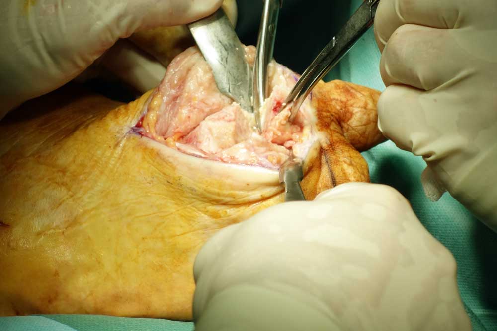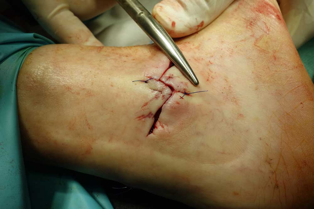 Die V‑Lappenplastik wird besonders im plantaren vorderen Fußbereich in der Projektion auf die Köpfchen der Mittelfußknochen verwendet. Dort befinden sich Mala perforantes, die zum Beispiel einer Mittelfußknochenresektion nach Baumgartner bedürfen. Beim plantaren Verschluss erfolgt ein V‑förmiges Ausschneiden des Malum perforans. Die Enden des V‑förmigen Schnitts können dann mit einem Entlastungsschnitt in 90° zum distalen Ende erweitert werden. Die Länge des Entlastungsschnittes richtet sich nach der Breite des zu verschließenden Defektes. Dies kann auch zweizeitig nach Interposition einer VAC (“vacuum assisted closure”) geschehen. Nach der Inzision wird in der Tiefe ein Lappen breit präpariert, bis er spannungsfrei den Defekt verschließen kann. Nach Einlage eines Antibiotikumträgers oder einer Drainage kann ein solcher Lappen spannungsfrei eingenäht werden.