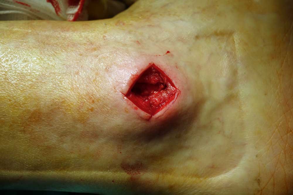 Die Rotationslappenplastik ist eine Möglichkeit, bei großer Wundchirurgie nach einer Amputation einen Wundverschluss durch einen Entlastungsschnitt zu bewirken, der gerade oder auch bogenförmig geführt werden kann. Die Entlastungsschnittführung ist abhängig von der Weichteilund Durchblutungssituation. Es ist deshalb sehr hilfreich für die Entscheidung des Chirurgen, wenn am Vortag durch Dopplersonographie insbesondere der Verlauf der Arteria tibialis posterior eingezeichnet wird, um intraoperativ böse Überraschungen zu vermeiden. Die Arterie verläuft aufgrund der anatomischen Vielfalt erfahrungsgemäß häufig dort, wo man gerade schneiden möchte (Abb. 3a‑e).