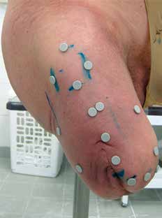 Vor diesem Hintergrund zielt das Pohlig Bionic Socket System (PBSS) 6 neben der distalen Schaftstabilisierung zur Maximierung der Bewegungsfreiheit auf eine objektiv reproduzierbare Anfertigung ab. Die Formerfassung erfolgt berührungslos via Scanner auf einer speziell für PBSS-Belange konstruierten dreidimensional einstellbaren Sitzeinheit. Nach entsprechender Vorbereitung dauert der definitive Scan nur 45 Sekunden, innerhalb derer die Muskulatur angespannt wird, sodass sich ein perfektes Relief realisieren lässt (Abb. 1). Im weiteren Verlauf werden alle Stumpfumfangmaße zusätzlich mit einem durch eine Gasdruckfeder normierten Maßband ermittelt. Zudem wird der gesamte Stumpf sonografisch ausgemessen, sodass der Verlauf der Muskulatur, mögliche Verknöcherungen oder Exostosen, vor allem aber die axialen Muskellücken ermittelt und gekennzeichnet werden können. Dadurch können die Stabilisatoren unvergleichlich genauer positioniert werden (Abb. 2).