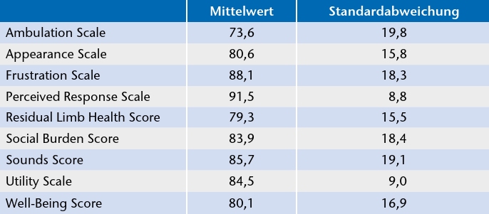 Die 9 PEQ-Scores umfassen: (I) „Ambulation” als Indikator für die Gehfähigkeit, (II) „Appearance” für das kosmetische Erscheinungsbild der Versorgung, (III) „Frustration” für generelle Probleme mit der Prothese, (IV) „Perceived Response”, repräsentativ für die Reaktionen durch Dritte, (V) „Residual Limb Health” für den Zustand des Stumpfes, (VI) „Social Burden” für die Integration in den sozialen Kontext im Alltag, (VII) „Sounds” für Probleme durch Prothesengeräusche, (VIII) „Utility” für die Prothesenhandhabe und (IX) „Well-Being” für den generellen Gesundheitszustand.
