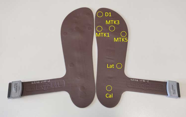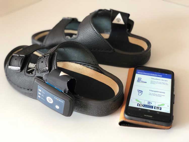 In der Studie “Smart Prevent Diabetic Feet” wurden insgesamt 288 Patienten mit Diabetes und fehlendem Gefühl in den Füßen (aufgehobenes Vibrationsempfinden im Stimmgabeltest < 3/8) eingeschlossen. Die Probanden wurden sodann im Verhältnis 1:1 randomisiert entweder der Interventionsoder der Kontrollgruppe zugeordnet. Beide Gruppen erhielten einen Vortrag zum Thema “Diabetisches Fußsyndrom” und wurden über die optimale Versorgung ihrer Füße aufgeklärt. Die Interventionsgruppe erhielt zusätzlich ein Mobiltelefon mit einer speziell zu diesem Zweck entwickelten App sowie ein Paar mit Temperatursensoren versehener Einlegesohlen, die in eine Pantolette eingelegt werden und darin getragen werden können. Die Einlegesohlen wurden kontinuierlich weiterentwickelt und sind zuletzt als sehr dünne Auflagen nutzbar (Abb.2). Die Zustimmung der Ethikkommission wurde eingeholt und eine schriftliche Einverständniserklärung durch die teilnehmenden Probanden abgegeben.
