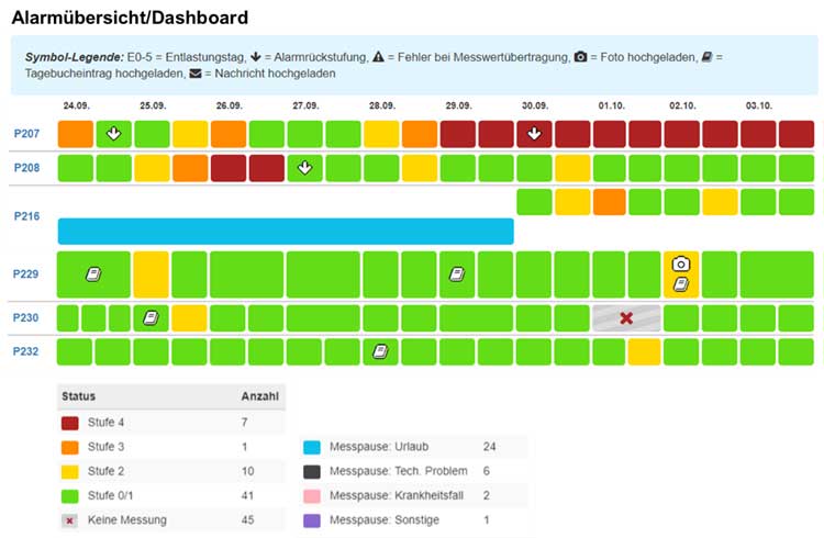 In der Studienzentrale werden die Daten für die beteiligten medizinischen Fachgruppen (Ärzte, Studienschwester, Wundschwester) übersichtlich in einem sogenannten Dashboard dargestellt (Abb. 3). Die Informationen werden regelmäßig abgerufen, um bei Auffälligkeiten mit den Patienten Kontakt aufzunehmen. Ein Algorithmus mit mehreren Alarmstufen wird aktiv, bevor die Probanden per App auf die auffälligen Temperaturen aufmerksam gemacht werden. Dies erfolgt vor dem Hintergrund, dass überflüssige Alarmierungen vermieden werden sollen. Sind in drei unabhängig durchgeführten Messungen jeweils Temperaturdifferenzen von über 1,5 °C aufgetreten, werden die Patienten aufgefordert, ihre Füße zu entlasten. Diese Entlastung sollte über fünf Tage stattfinden, indem der entsprechende Fuß möglichst wenig genutzt und hochgelagert werden soll. Im Anschluss wird ausgewertet, ob eine Normalisierung der Temperatur eingetreten ist oder nicht.