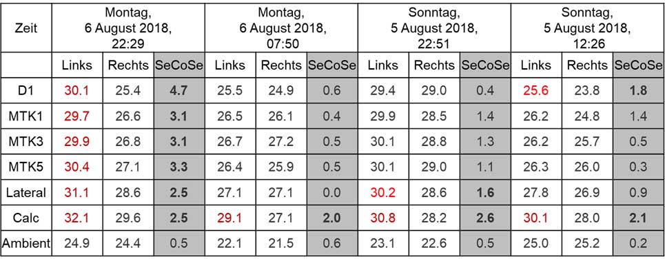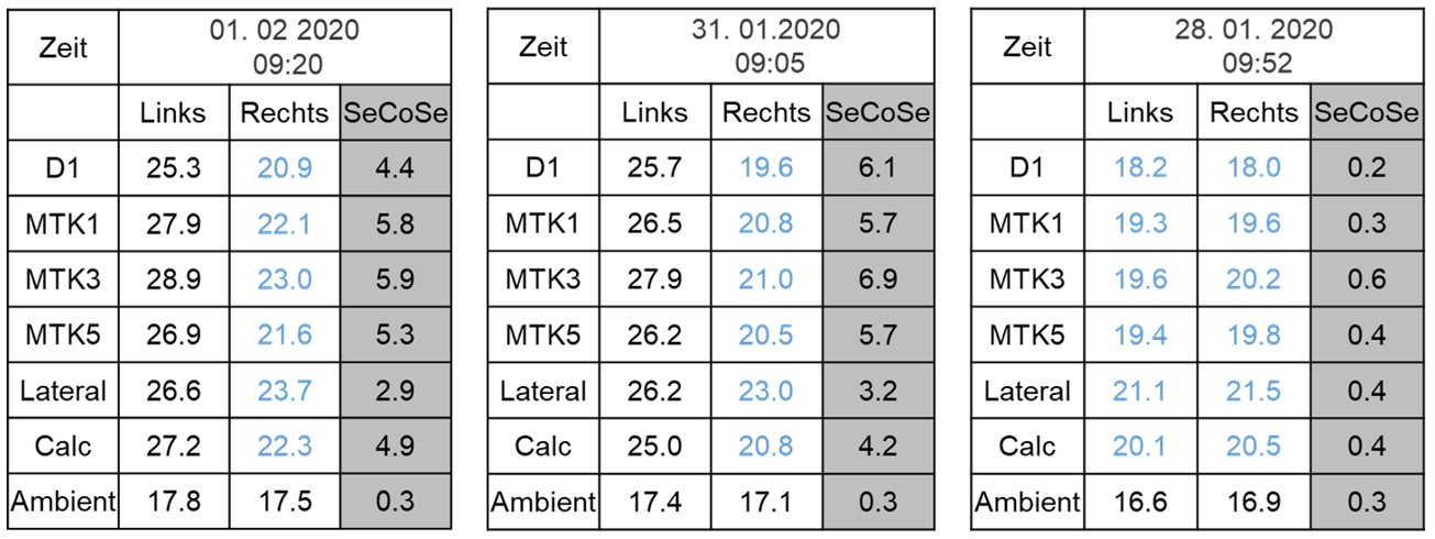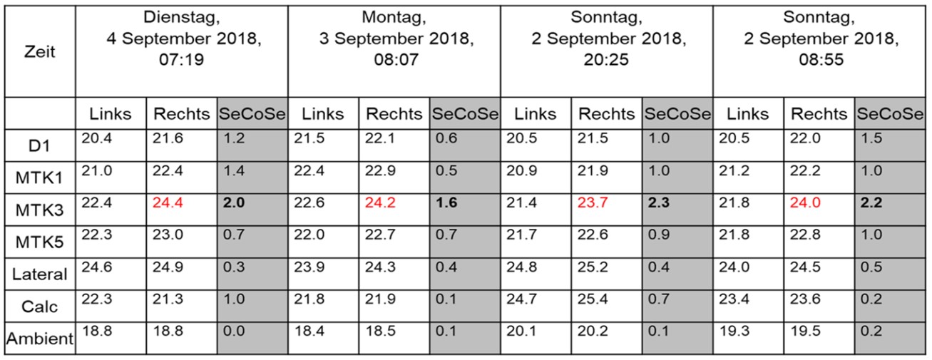 Ein Problem bei der Auswertung der Temperaturmesswerte besteht darin, dass zwischen einem regionalen Temperaturanstieg und einem Temperaturabfall im gesamten Fuß aufgrund von Minderdurchblutung unterschieden werden muss. Dies ist in einem Fall sehr gut nachvollziehbar, bei dem der gesamte Fuß einseitig deutlich abgekühlt war. Die alleinige Betrachtung der Temperaturwerte offenbarte, dass der Fuß sogar Werte unterhalb der Raumtemperatur aufwies (Abb. 7) (Tab. 3). Das Studienteam entschloss sich daher, jeweils den Temperaturunterschied über den Fuß (Temperaturgradient zwischen Calcaneus und Vorderfuß) zu kalkulieren und zu interpretieren. Um die Wahrscheinlichkeit einer korrekten Interpretation zu erhöhen, wurden Fragenlisten entworfen, bei denen unter anderem Einschränkungen der Gehstrecke und Claudicatio-Symptome abgefragt werden. Die direkte Interaktion mit den Probanden erlaubt es, Veränderungen auf ihre Plausibilität hin zu überprüfen und Fehlinterpretationen zu minimieren.
