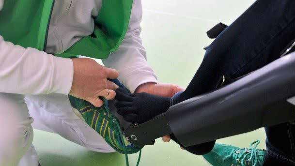In Vorbereitung der Erprobung wurden die Anwendermaße – Beinlänge, Gelenkpunkte an Hüfte und Kniegelenk, Beckenbügelweite und Schuhgröße – entsprechend dem Maßblatt abgenommen. Somit konnte das ReWalk-Exoskelett für diese Erprobung mit den anwenderspezifischen Zubehörteilen und gemäß den nochmals überprüften Maßen vor der ersten Anprobe aufgebaut werden. Der Anwender transferiert aus dem Rollstuhl in das im Sitzmodus positionierte Exoskelett. Das Anlegen des Systems erfolgt distal beginnend mit dem Anziehen der Schuhe mit den innenliegenden Systemfußplatten (Abb. 2). Nachfolgend wird nach proximal fortschreitend die Standardbegurtung angelegt und somit das System am Körper fixiert. Der Rucksack mit Steuerelektronik und Akku wird zuletzt angelegt.