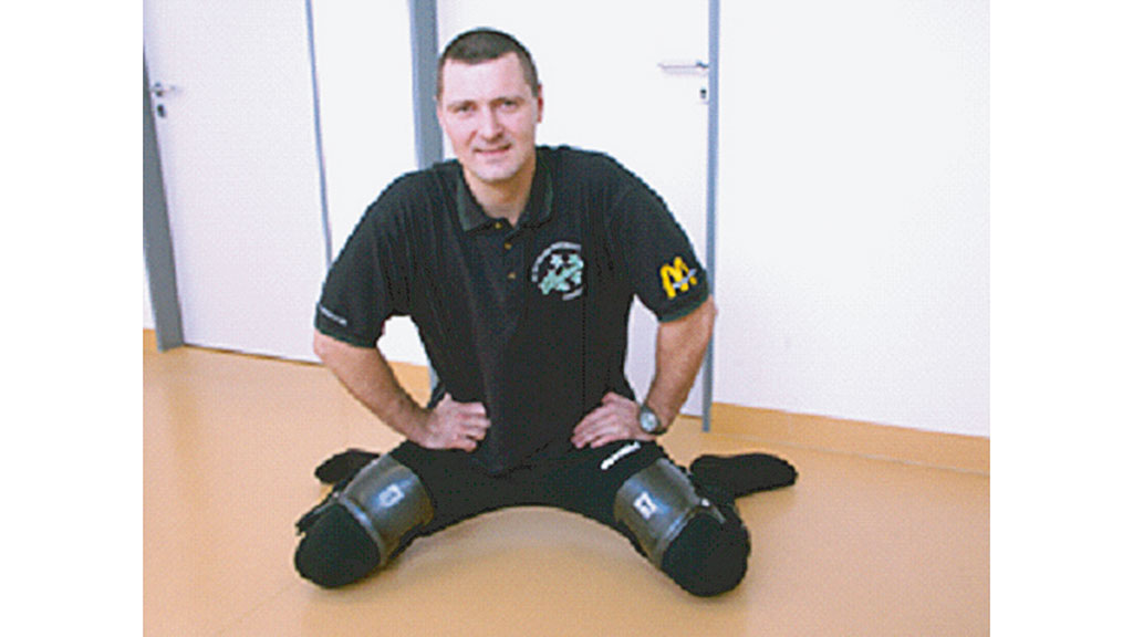 - Als erste Modifikation wurde die Anbindung von Knieorthesen mittels Klettverschlüssen bei Eishockey-Torwarten und Motocross-Fahrern untersucht. Hier kam es zur ersten Modifikation des kniegelenknahen Oberschenkelverschlusses in Form eines teilelastischen Bandes, um die sogenannte „Butterfly-Stellung“ des Eishockey-Torwarts schneller und besser zu gewährleisten (Abb. 7 u. 8). Das Entfernen des kniegelenknahen Oberschenkelverschlusses wurde ebenfalls bei Offroad-Fahrern getestet und als Variationsmöglichkeit aufgenommen.
