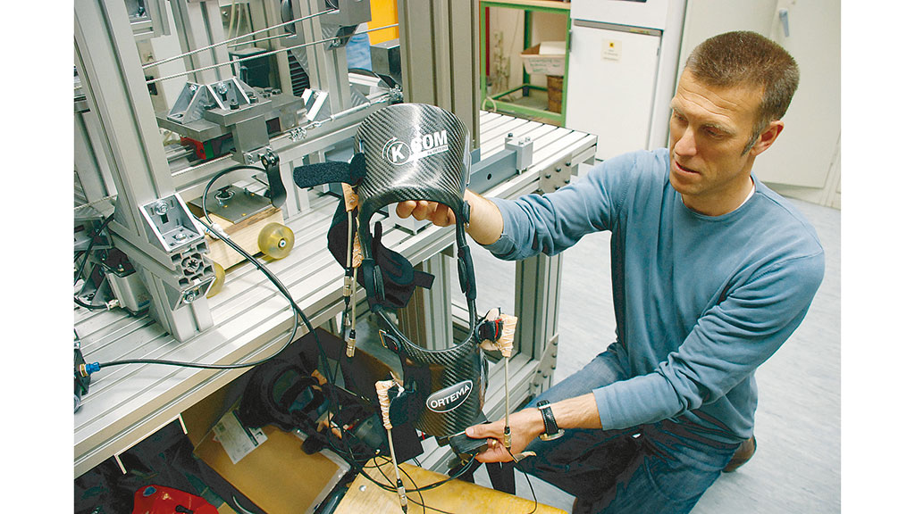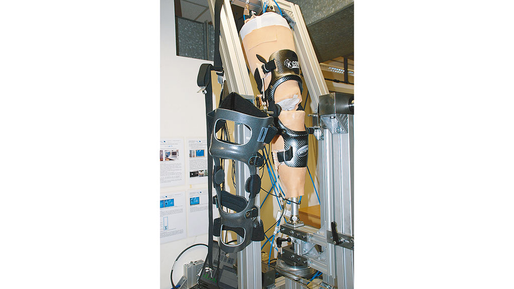 Nach dieser EMG-basierten Auswertung fand sich eine Expertengruppe aus Nationalmannschaftsärzten, Chef-Trainern Ski-Alpin, Experten des Olympiastützpunktes Bayern, Sportwissenschaftlern und Medizinern der TU München, Fertigungsexperten aus der Materialtechnologie und erfahrenen Orthopädie-Technikern aus dem Bereich Knieorthetik zusammen. Die Gruppe analysierte bestehende Systeme und Überlegungen zu Modifikationen und stellte weitere Messungen auf einem Kniesimulator an (Abb. 10).