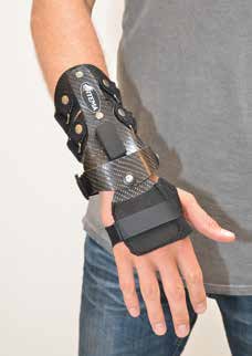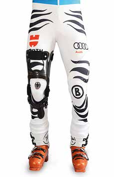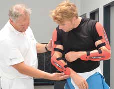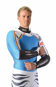 Durch die Entwicklung innovativer Hightech-Materialien zur Herstellung der Sportgeräte werden die Beschleunigungen und Belastungen der Gelenke weiter nach oben getrieben. So ist es heute keine Seltenheit mehr, dass Rückenprotektoren im alpinen Rennlauf auch im Slalom zum Schutz der Wirbelsäule eingesetzt werden. Diese werden unter dem Rennanzug getragen und müssen vom Reglement zugelassen sein. Das gilt auch für Protektoren für Schulter und Ellbogen/ Unterarm (Abb. 9). Durch den häufigen Kontakt mit den Torstangen in allen Disziplinen des Alpinbereichs treten beträchtliche Verletzungen an der oberen Extremität auf, die zu entzündlichen Prozessen und im schlimmsten Fall sogar zu offenen Wunden sowie Exostosen führen können. Auch hier ist ein rutschfreier anatomischer Sitz entscheidend und eine entsprechend große Protektionsfläche erforderlich, um die verschiedenen Aufschlagwinkel gut abzudecken. Seit einigen Jahren werden Unterarmprotektoren (Abb. 10) über dem Rennanzug getragen, die das Abgleiten der Torstangen fördern und so eine noch aggressivere Fahrweise zulassen.