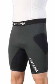 Regelmäßig entsteht bei Leistungssportlern die Problematik einer Überlastung, Zerrung und Überdehnung im Hüft‑, Leisten- und Adduktorenbereich. Dazu wurden eigens sogenannte Compression-Shorts mit integriertem Stabilisierungssystem entwickelt (Abb. 11). Ein solches dreidimensional wirkendes, „gebondetes“ Textil (dabei handelt es sich um die dauerhafte Verschmelzung unterschiedlicher Textilien und elastischer Gurte) unterstützt die Wirkweise gelenkübergreifender komplexer Muskelketten. Dies ermöglicht zum einen eine Entlastung der Sehnenansätze in der Leiste, zum anderen eine Stabilisierung der Hüfte. Dies führt zu einer Schmerzlinderung und Entlastung in Training und Wettkampf, vor allem bei intensiven und explosiven Bewegungen. Durch die dünne, leichte Konstruktion kann die Kompressionshose auch bei ISG- Blockaden und Schmerzen im unteren Rücken ohne Einschränkung der Performance des Athleten eingesetzt werden.