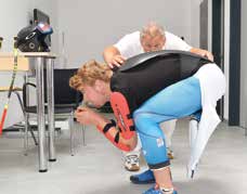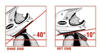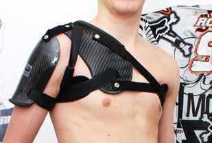 Im Moto-Cross und im Mountainbike-Downhillsport spielt die Versorgung der Halswirbelsäule bzw. der Clavicula eine wichtige Rolle. Dabei kommen mittlerweile sogenannte Neckbraces (Abb. 2) zum Einsatz. Diese sollen im Falle eines Sturzes ein Überstrecken der Halswirbelsäule bzw. eine Verletzung der Clavicula durch die eigene Helmunterkante vermeiden. Leider kommt es bei diesen Rasanzsportarten bei Stürzen immer wieder zu einem Hyperextensions- oder Flexionstrauma, das die Halswirbelsäule massiv schädigen kann. Im schlimmsten Fall kann es dabei sogar zu einer Querschnittlähmung kommen. Aus diesem Grund wurde das Nackenschutzsystem „Ortema Neck Brace“ (ONB) entwickelt, das aus einem speziellen Kunststoff gefertigt ist. Wie ein Kragen umfasst es die Halswirbelsäule und hat eine tellerähnliche Ausarbeitung im Dorsalbereich, um die übermäßige Hyperextension des Kopfes zu vermeiden. Bei einem Sturz oder Schlag trifft die Helmhinterkante dosiert auf das Neck Brace, wird abgebremst und vermeidet dadurch wirkungsvoll eine Überstreckung der Halswirbelsäule. Die Impact energie wird durch Verformung des Nackenschutzes in Spannungsenergie umgewandelt. Somit lässt sich der Restimpact, der auf den Körper wirkt, deutlich vermindern und die Auslenkung der Halswirbelsäule limitieren. Das Neck Brace wird vorne geöffnet und verfügt über ein Filmscharnier, sodass Front- und Rückteil gelenkig miteinander verbunden sind. Die Kraftableitung erfolgt nach biomechanischen riterien im Rückenbereich über ein Hufeisensystem auf die Schulterblätter. Das flächenmäßig große knöcherne Schulterblatt mit den darunter liegenden Muskeln und den Rippen bietet ein eigenes Dämpfungssystem und ist für einen Abbau der Impactenergie wie geschaffen. Mittels klettbarer Pads ist das Nackenschutzsystem einfach zu justieren und an die Anatomie des Sportlers anpassbar. Harte, rigide Konstruktionen können zu knöchernen Verletzungen führen, vor allem, wenn die Kraft direkt auf die Wirbelsäule abgeleitet wird. Das gilt es natürlich zu vermeiden.