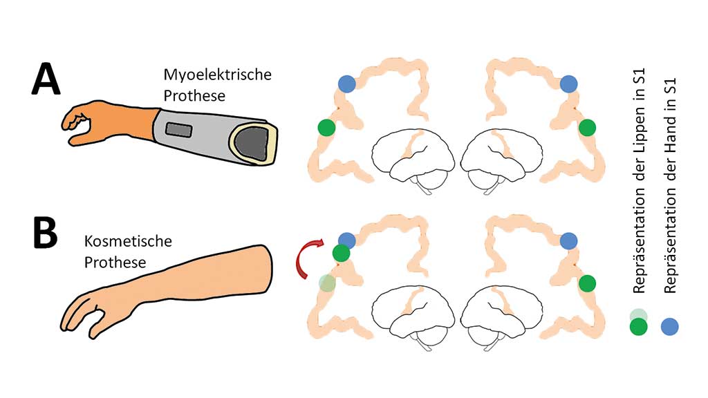 Neben Veränderungen des peripheren Nervensystems scheinen vor allem amputationsbedingte Anpassungen des Zentralnervensystems maßgeblich an der Entstehung und Aufrechterhaltung des PSz beteiligt zu sein. Dem primären somatosensorischen Kortex (S1) kommt dabei eine besondere Rolle zu: Traditionell wird dieser Hirnbereich als primäre Verarbeitungsinstanz für somatosensorische Informationen wie beispielsweise Berührungsreize angesehen; tatsächlich ist seine Funktion jedoch um ein Vielfaches komplexer, und er scheint maßgeblich an sensomotorischen Lernprozessen beteiligt zu sein. In S1 ist jeder Teil des Körpers in einem eigenen Bereich repräsentiert, der in seiner Größe der Berührungssensitivität des jeweiligen Körperteils entspricht. So ist in dieser sogenannten Körperkarte beispielsweise die Lippe überproportional groß und nah zur ebenfalls überproportional vergrößerten Repräsentation der Hand lokalisiert. Nach einer Amputation verschiebt sich die Körperkarte in S1: Bei Menschen mit einer Armamputation beispielsweise breitet sich die Repräsentation der Lippe in den ehemaligen Armbereich aus, sodass die Nervenzellen dieser Region von nun an sensorische Informationen aus dem Gesicht verarbeiten 3. Dieser als „Reorganisation“ bezeichnete Prozess stellt ein neurophysiologisches Äquivalent zur veränderten Körperintegrität nach einer Amputation dar. Interessanterweise steht das Ausmaß der Reorganisation mit der Stärke des PSz in direkter Relation: Je mehr die Lippenrepräsentation in das ehemalige Handareal eingewandert ist, desto stärker ist der PSz 4. Bei Menschen mit einer Beinamputation finden vergleichbare Prozesse statt, die sich jedoch auf andere Repräsentationen der Körperkarte, beispielsweise die Hüfte, beziehen. Obwohl die Art des Zusammenhangs noch nicht vollständig geklärt ist, kann vermutet werden, dass die Verhinderung oder Rückgängigmachung der Körperkartenveränderung einen vielversprechenden Ansatz für die Therapie von PSz darstellt. Prothesen könnten hierfür besonders geeignet sein.