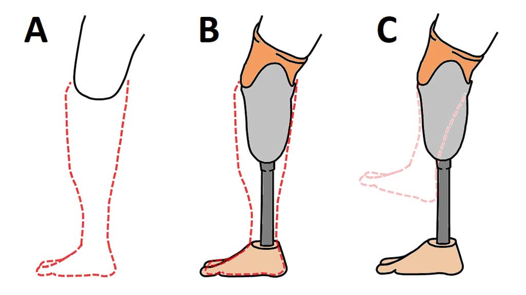 In einer anderen Studie, die nur an Menschen mit Beinamputation durchgeführt wurde, wurden des Weiteren ein realistisches Aussehen der Prothese, eine gute Stumpfbettung und eine gute Stumpfgesundheit als wichtige mit der VK von Prothesen zusammenhängende Faktoren identifiziert 20. Obwohl die Wahrnehmung eines Phantoms (Abb. 2a) per se wohl keinen Prädiktor für die VK einer Prothese darstellt, legt eine vorläufige Auswertung eigener unveröffentlichter Daten nahe, dass das Gefühl, das Phantom überlagere die Prothese und bilde mit ihr eine Einheit (Abb. 2b), positiv mit der VK zusammenhängt; weicht das Phantom der Prothese aus und wird isoliert von ihr wahrgenommen, ist die VK geringer (Abb. 2c). Dieses Ergebnis deutet darauf hin, dass eine erfolgreiche Phantom-Prothese-Interaktion das Erleben von VK begünstigen kann. Die Forschung zu den Voraussetzungen von VK steht allerdings erst am Anfang, sodass die Bedeutung der hier berichteten Effekte bisher noch nicht abschließend bewertet werden kann.