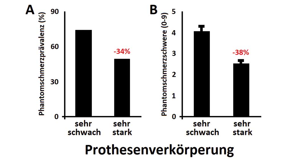 Entscheidend war jedoch das Ergebnis einer weiteren Analyse, in der die Effekte anderer Variablen (z. B. Amputationsniveau und Prothesennutzungsfrequenz) statistisch kontrolliert wurden: Hier zeigte sich, dass die VK der Prothese signifikant negativ mit PSz assoziiert war, während die Frequenz der Prothesennutzung für sich genommen keinen signifikanten Zusammenhang zeigte. Dies deutet darauf hin, dass wahrnehmungsabhängige Effekte der Prothesennutzung eine entscheidende Rolle für das Erleben von PSz spielen könnten: Vermutlich normalisiert die Prothesennutzung die durch die Amputation gestörte Integration sensorischer und motorischer Informationen, was durch eine verkörperte Wahrnehmung der Prothese noch verstärkt wird. Sollte sich diese Vermutung bestätigen, könnte dies bedeuten, dass eine hochgradig verkörperte Prothese die mit dem PSz zusammenhängenden Gehirnveränderungen verhindern oder sogar rückgängig machen könnte. Tatsächlich deuten eigene, unveröffentlichte Daten darauf hin, dass die VK der Prothese mit einer normalisierten Körperkarte in S1 assoziiert ist. Die Frage jedoch, ob die Zusammenhänge kausaler Natur sind, kann noch nicht abschließend beantwortet werden.