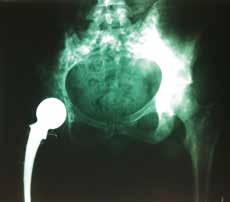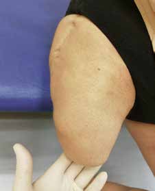 Im Alter von 14 Jahren wurde bei der Patientin ein Osteosarkom im rechten distalen Femur diagnostiziert. Der Tumor befand sich an der Medial- und Dorsalseite des Femurs bis handbreit oberhalb des Kniegelenkspaltes. In weiteren Untersuchungen wurden Markraumveränderungen bis knapp unterhalb des Trochanter minor festgestellt. Aufgrund dieses Ausmaßes erfolgte eine Hüftexartikulation mit direkter Implantation einer Großkopf-Endoprothese. Um die Versorgung mit einer Hüftex-Prothese zu umgehen, wurde in der Operation das natürliche Acetabulum erhalten, die Großkopf-Endoprothese implantiert und somit die Möglichkeit gegeben, die Patientin mit einer OS-Prothese zu versorgen. Der Schaft der Endoprothese wurde mit Knochenzement ummantelt, um die Rekonstruktion der Muskelansätze zu ermöglichen (Abb. 1a u. b). Aufgrund der durch Myodese rekonstruierten Muskulaturansätze ist die Weichteildeckung vor allem im distalen Bereich als eher ungünstig zu bewerten; das distale Ende des mit Knochenzement ummantelten Endoprothesenschaftes ist deutlich zu ertasten (Abb. 2).