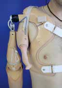 Bei der Herstellung und Anpassung der Testschäfte wurden bereits alle Änderungen und Zuschnitte aus der Diagnoseschaftphase übernommen und ausgeführt. Der Testschaft für den rechten Oberarmstumpf wurde aus Thermoflex-Material, die Thoraxschale aus Polyethylen gefertigt. Der Aufbau der Testprothese mit allen Passteilkomponenten und der notwendigen Bandagentechnik konnte im Anschluss durchgeführt werden (Abb. 5).