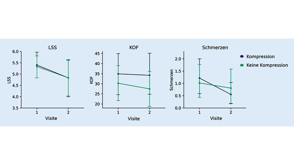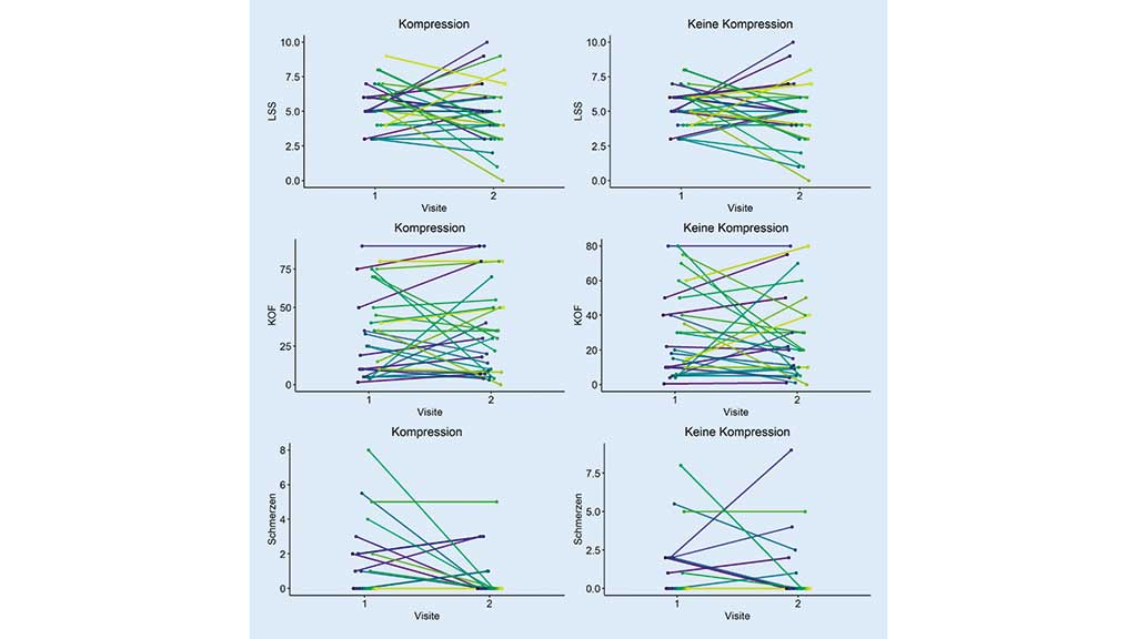 - Für einzelne der erhobenen Parameter, wie z. B. Schmerzen im Bereich der Unterschenkel, ergab sich eine Tendenz hin zu einem Vorteil für das komprimierte Bein.