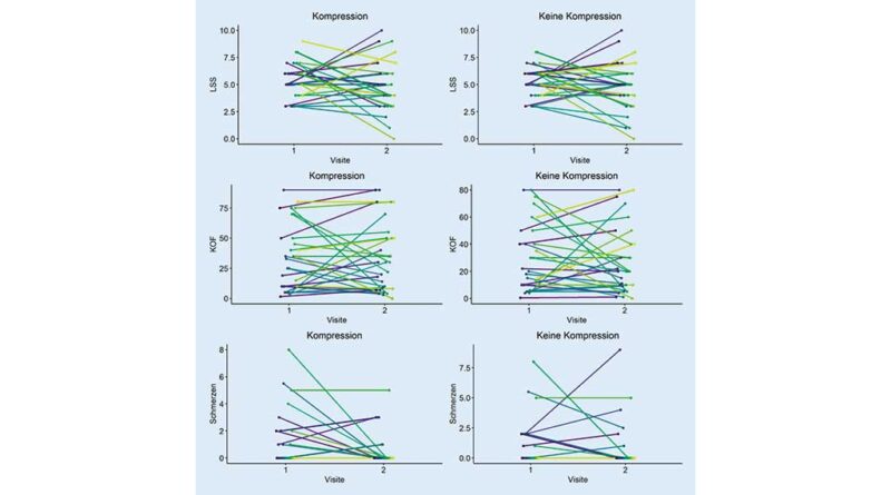 Ergebnisse: In die finale Analyse gingen die Daten von 30 Patienten ein. Die mittleren LSS-Befunde sowie die subjektiven Schmerzen der Patienten zeigten in der rein deskriptiven Auswertung eine geringgradig stärkere Verbesserung im Bereich des komprimierten im Vergleich zum nicht komprimierten Unterschenkel. Es ergaben sich keine Hinweise auf ein Köbner-Phänomen.