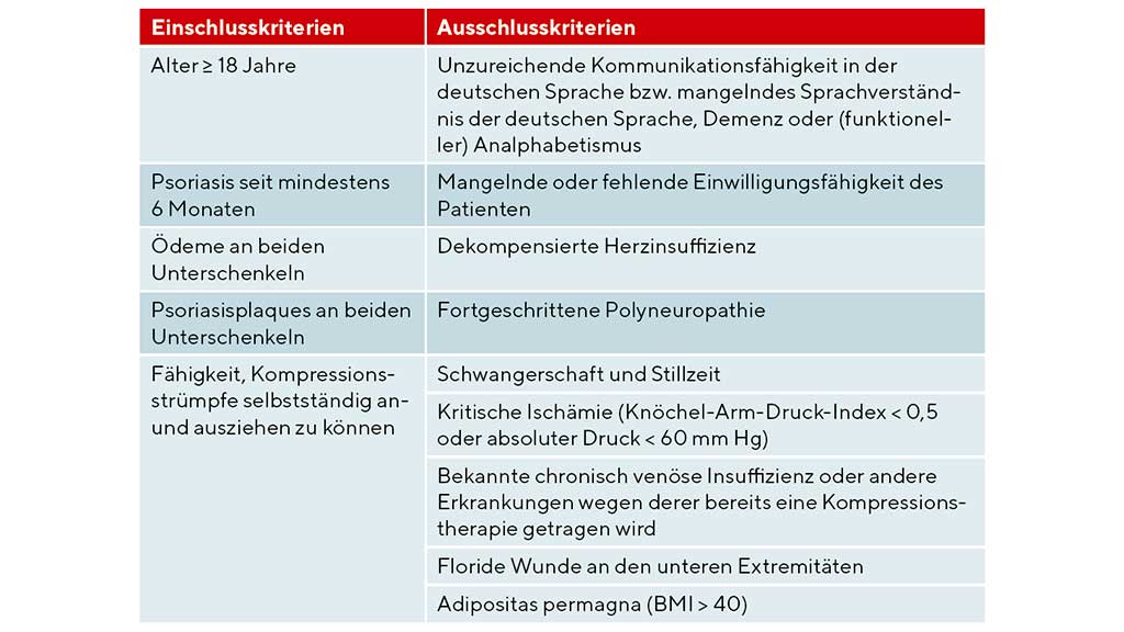 Das Ziel der vorliegenden klinischen Studie bestand daher darin, mithilfe eines Halbseitenversuchs die Fragestellung zu untersuchen, inwiefern durch eine Kompressionstherapie die Abheilung von Psoriasisplaques an den Unterschenkeln bei vorliegenden Ödemen beeinflusst werden kann.