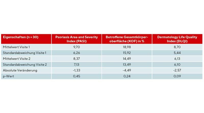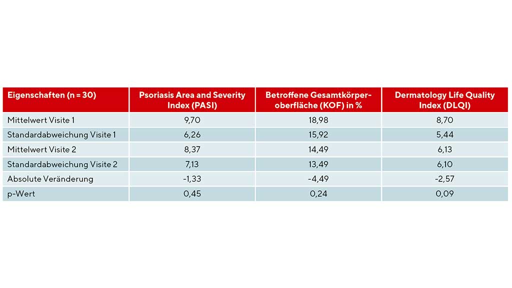 Im Verlauf der Studie zeigten sich sowohl der Gesamt-PASI und die Gesamt-KOF sowie der DLQI regredient (Tab. 3).