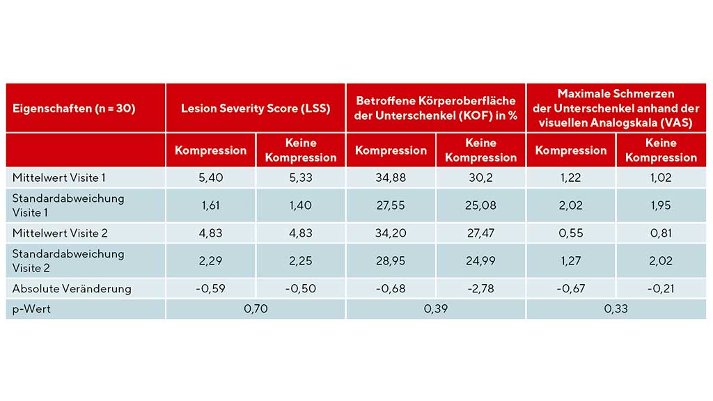 Der primäre Endpunkt der Studie war das klinische Ansprechen der Psoriasisplaques an den Unterschenkeln im Seitenvergleich (SoC vs. SoC + Kompressionstherapie) gemessen mittels LSS sowie KOF in Woche 4 im Vergleich zum Ausgangsbefund, sodass ein möglicherweise auftretendes Köbner-Phänomen oder Verbesserungen der Hautveränderungen objektiviert werden konnten. Sekundäre Endpunkte waren Schmerzen anhand der VAS, Entwicklung der Beinumfänge sowie Zufriedenheit und Erfahrung mit der Kompressionstherapie aus Patientensicht in Woche 4 im Vergleich zum Ausgangsbefund.