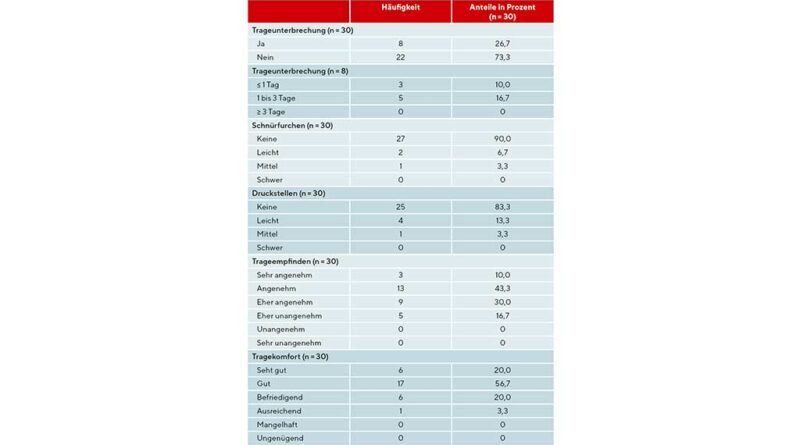 Insgesamt wurde der Komfort der Kompressionstherapie positiv bewertet (Mittelwert nach Schulnoten 2,07, Standardabweichung 0,74). Mehr als die Hälfte der Patienten beschrieb das Trageempfinden als angenehm (43,3 %) bzw. sehr angenehm (10,0 %). Lediglich 16,7 % der befragten Patienten empfanden das Tragen der Kompressionstherapie als eher unangenehm. Von den Befragten vergaben 76,7 % dementsprechend mindestens die Schulnote „gut“ in Bezug auf den Tragekomfort. Schnürfurchen und Druckstellen blieben in den allermeisten Fällen aus. Die Auswertung der Patiententagebücher ergab, dass bei 22 Patienten (73,3 %) keinerlei Trageunterbrechungen auftraten. Die 8 Patienten, die Trageunterbrechungen angaben (26,7 %), berichteten in keinem Fall eine Trageunterbrechung von mehr als 3 Tagen (Tab. 5).