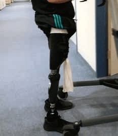 Im weiteren Verlauf waren einerseits tägliche intensive physiotherapeutische Behandlungen zur Funktionserweiterung der gelenkführenden Extremitäten sowie eine Muskelkräftigung und Ausdauersteigerung notwendig. Parallel verliefen Anpassungsarbeiten mit Abstimmungen der Knieprogrammierung und Aufbauregulierungen. Es wurden zwei Paar Probeschäfte gefertigt, um eine beschwerdefreie Basis für die Definitivversorgung zu erzielen. Gegen Ende der vierwöchigen Testphase waren bis zu 300 Meter lange Wegstrecken auch im Außenbereich auf unebenem Grund unter Verwendung eines langen Gehstocks rechts und eines Fritz-Stocks links möglich. Der Patient war in der Lage, frei zu stehen, und konnte die Prothesen selbstständig an- und ablegen – allerdings erschien die Lösung mit Klettverschlüssen am Schaft wegen der Funktionsdefizite beider Hände nicht sehr praktikabel. Für die Definitivversorgung sollte also ein Verschlusssystem ermittelt werden, welches das Anlegen der Prothesen deutlich erleichtert.