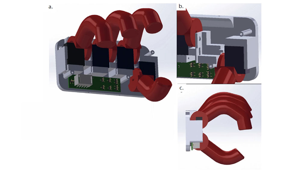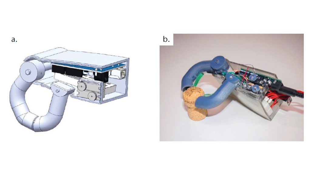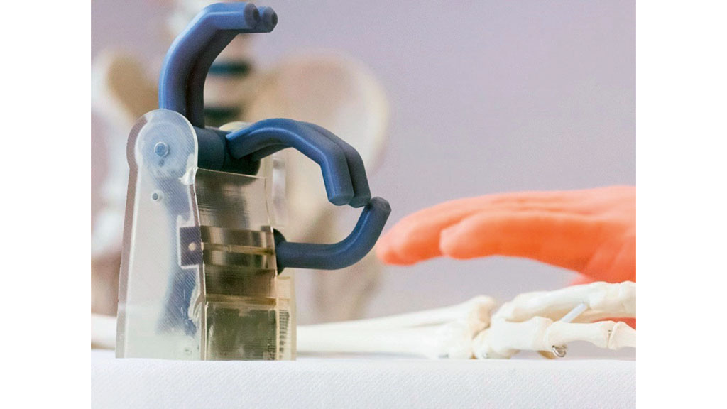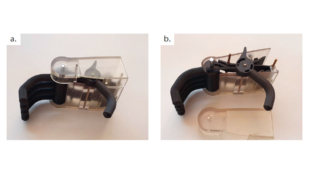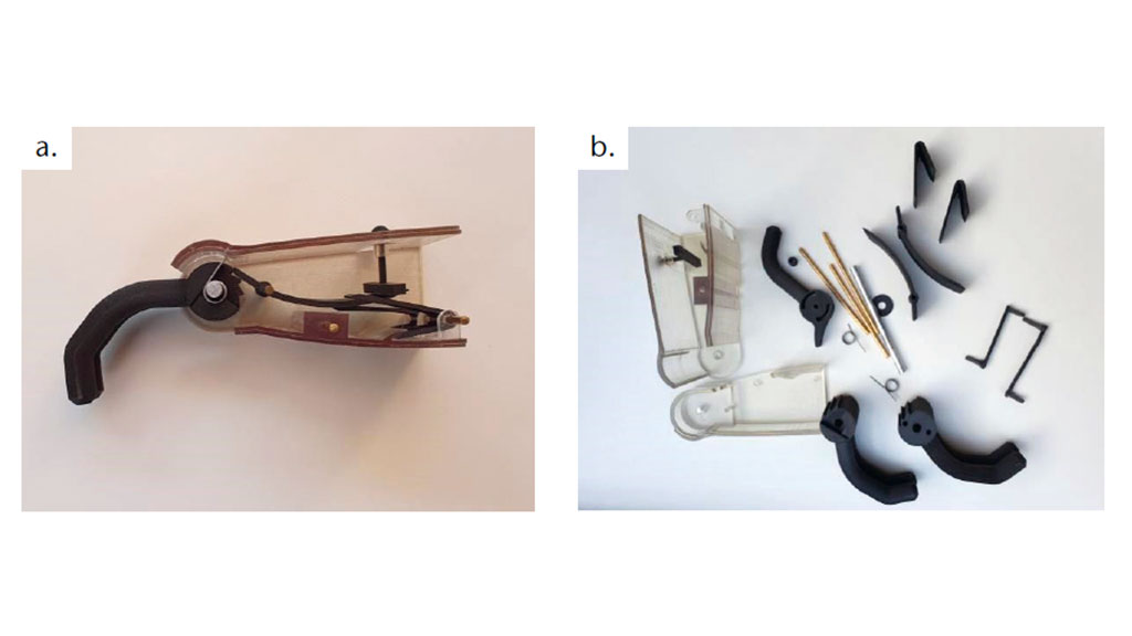 Daher wurde der Mechanismus des Daumenhebels entsprechend wie folgt überarbeitet: Der neu entwickelte Mechanismus des Daumengelenks, der eine gegenläufige Drehung von Finger- und Daumenrolle bewirkt, wurde mit zwei Krafthebeln realisiert. Dadurch wurden die Spannung und die Verteilung der Kräfte in den Teilen verbessert10. Das 3D-gedruckte Polymer-Replikat ist in Abbildung 4 zu sehen.