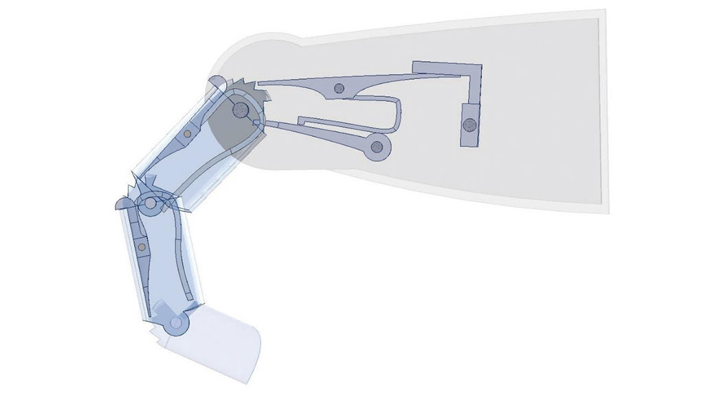 Aktuell sind wir deshalb dabei, auch die zweite „Eiserne Hand“ zu rekonstruieren. Die Mechanik hierzu ist allerdings wesentlich aufwändiger. In Abbildung 9 lässt sich ein Teil der komplexen Mechanik in einer 3D-CAD-Rekonstruktion erahnen. Die CAD-Abbildung lässt erkennen, wie kompliziert und filigran die Fingerglieder miteinander verbunden sind, und zeigt auf, warum die einfachere erste „Eiserne Hand“ wesentlich stabiler und alltagstauglicher für Nutzer ist. Beim Ausdruck der Teile der zweiten „Eisernen Hand“ mit einem Multimaterial-Polymer-Drucker zerbrachen die Hebel und Federn des Fingermechanismus schon nach wenigen Bewegungen, während das Polymerreplikat der ersten Hand noch nach Jahren steter Benutzung und Vorführung einwandfrei funktioniert.