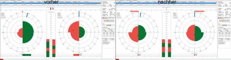 Ziel dieser Untersuchungen war festzustellen, ob sich eine negative Belastungsverteilung wie in Abbildung 9 links dargestellt (einseitige Lastverteilung führt zu schlechteren Gleiteigenschaften) durch geeignete Veränderungen in Sprengung, Skischuh und Präventhese positiv verändern lässt. Insbesondere in der Veränderung des Kraftangriffspunktes ist es bei dieser Probandin eindrucksvoll gelungen, eine zentrale, symmetrische Belastung zu erzielen.