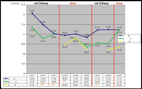 Die Laufzeiten in den einzelnen Fahrten und die Rückmeldungen der Sportler legten den Schluss nahe, dass die Gelenke, wie sie bei den herkömmlichen Orthesen verwendet werden, zu keiner Einschränkung der Performance führen. Eine exakte Nachbildung der komplexen Kniekinematik schien also nicht notwendig.