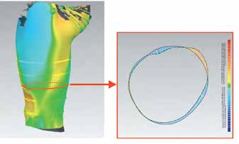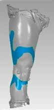 Die zweite Ebene besteht aus zwei Carbonschalen, die zur Anbindung der dritten Ebene dienen und selbst schon geringe bis mittlere Kräfte aufnehmen können. Zur Gestaltung dieser Schalen werden die Beine jedes Skiathleten mittels eines 3‑D-Oberfächenscanners in verschiedenen skitypischen Beugewinkeln gescannt (Abb. 6a/b). Über eine speziell von der Entwicklergruppe erstellte Software können die Stellen am Bein definiert werden, die bei den skitypischen Bewegungen keine oder keine relevante Muskelvolumenveränderung aufweisen. Diese Areale am Bein werden per Computerprogramm gekennzeichnet und dienen als idealer Ort für die Anbindung der Orthese am Bein.
