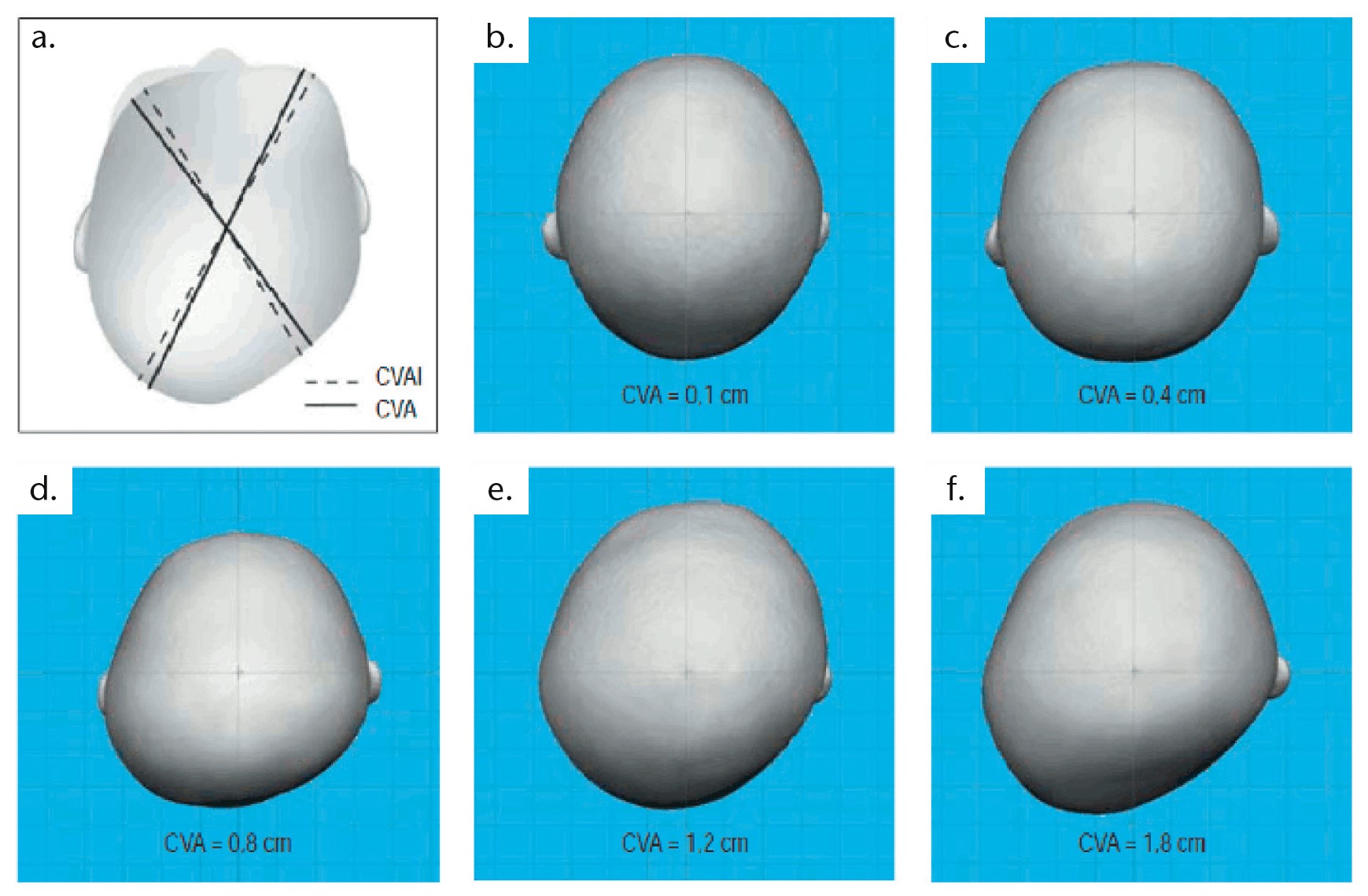 Der Cranial Vault Asymmetry Index (CVAI) wurde erstmals von Loveday et. al 20017 eingeführt und gibt den Grad der Verformung in Prozent an und ist seither internationaler Standard zur Bestimmung des Grades der Verformung. Zur Bestimmung der diagonalen Achsen wird der Schädel in eine Längs- und eine Querachse geteilt. Jeweils 30 Grad rechts und links von der Längsachse weg werden die Diagonalen gebildet (Abb. 1, gestrichelte Linie). Zur Bestimmung des CVAI wird die kürzere Diagonale b von der längeren Diagonale a subtrahiert und durch die kürzere Diagonale dividiert. Das Ergebnis wird dann mit 100 % multipliziert8.
