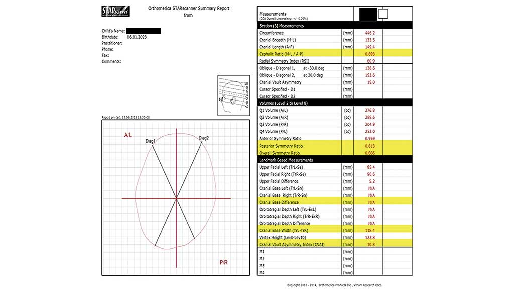 Unter Einbeziehung des Scans werden die tatsächliche Kopfform und das Ausmaß der Asymmetrie festgestellt. Das Alter und der Schädelumfang werden berücksichtigt, um ein mögliches Wachstumspotenzial abschätzen zu können. Zusätzlich werden Begleiterkrankungen, Diagnosen oder Auffälligkeiten im Alltag des Säuglings abgefragt, um diese bei der Auswahl der Versorgung berücksichtigen zu können.