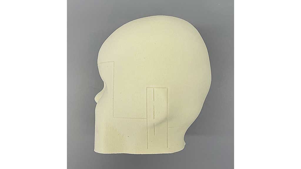 Der Randverlauf ist so gewählt, dass das Gesichtsfeld und damit die Sicht des Säuglings uneingeschränkt ist. Der Stirnabschluss verläuft oberhalb der Augenbrauen. Der Abschluss an den Schläfen ist so zu wählen, dass er im vorderen Bereich die Augen nicht einschränkt und im hinteren Bereich das Ohr nicht bedeckt. Der Abschluss liegt oberhalb des Ohrläppchens. Im Hinterhauptbereich liegt der Abschluss in Höhe des Ohrläppchens, wobei bei der späteren Anprobe darauf zu achten ist, dass eine uneingeschränkte Bewegung des Schädels möglich ist. Das virtuelle Modell wird dann aus einem Polyurethan-Schaum mit einer Dichte von 140 kg/m³ gefräst (Abb. 4).