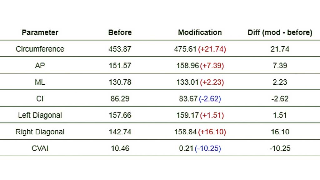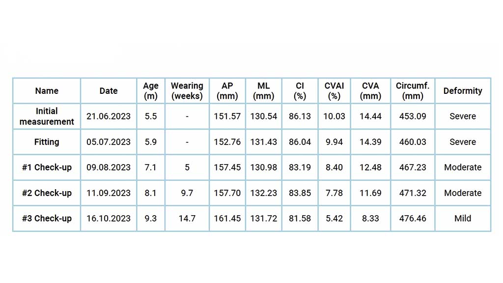 Ist der Helm virtuell erstellt, folgt der Druckauftrag. Mit Hilfe eines Modifikationsreportes werden die Maße und Daten in unterschiedlichen Grafiken dargestellt. Die Tabelle 1 geht in der linken Spalte auf die einzelnen gemessenen Umfangs‑, Breiten- und Diagonalmaße ein. In der 2. Spalte von links sind die zum Zeitpunkt der Maßnahme entstandenen Maße hinterlegt und in der 3. Spalte ist das berechnete Wachstum aufaddiert. Die rechte Spalte gibt dabei die Differenz zwischen den Ausgangsmaßen und den modifizierten Maßen an12.