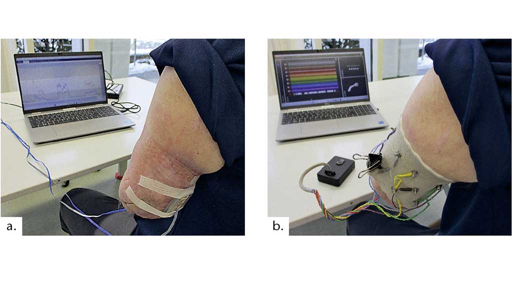 Um festzustellen, welche Prothesenart individuell anwendbar ist und welches Steuerungssystem eine betroffene Person umsetzen kann, wird bereits sehr früh eine Myotestung durchgeführt (Abb. 1). Unter Myotestung versteht man die graphische Abbildung der vorhandenen Muskelpotenziale, die zur Steuerung einer Prothese verwendet werden könnten. Mit dieser softwareunterstützten Darstellung kann den Patienten die Muskelkontraktion visualisiert werden. Mit der visuellen Rückmeldung ist es den Klienten möglich, Muskeln selektiv anzusteuern und so zu trainieren, dass diese dauerhaft reproduziert werden können. Dies kann zum einen mit 2 EMG-Elektroden zur Muskelsignalsuche durchgeführt werden. Sind die Muskelsignale so schwach, dass eine 2‑Elektrodensteuerung nicht möglich ist, kann zum anderen mithilfe von „Elektrodenmanschetten“ eine Evaluation für komplexere Steuerungssysteme durchgeführt werden.