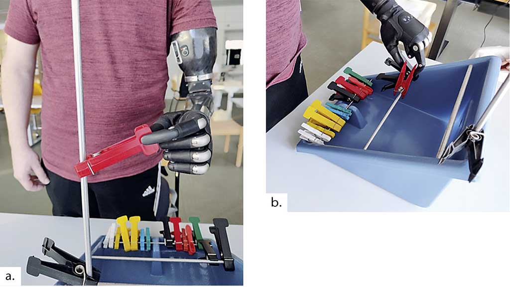 Des Weiteren bietet der „Clothes-pin Relocation Test“ eine Möglichkeit, die Nutzung der Prothese in allen Ebenen und mit Einschluss aller Komponenten zu überprüfen (Abb. 4). Dabei muss mit Wäscheklammern, die einen unterschiedlich starken Widerstand haben, in verschiedenen Positionen hantiert werden. Somit muss der Ellbogen teilweise gestreckt oder gebeugt, die Hand gedreht sowie auf- und zugemacht werden.