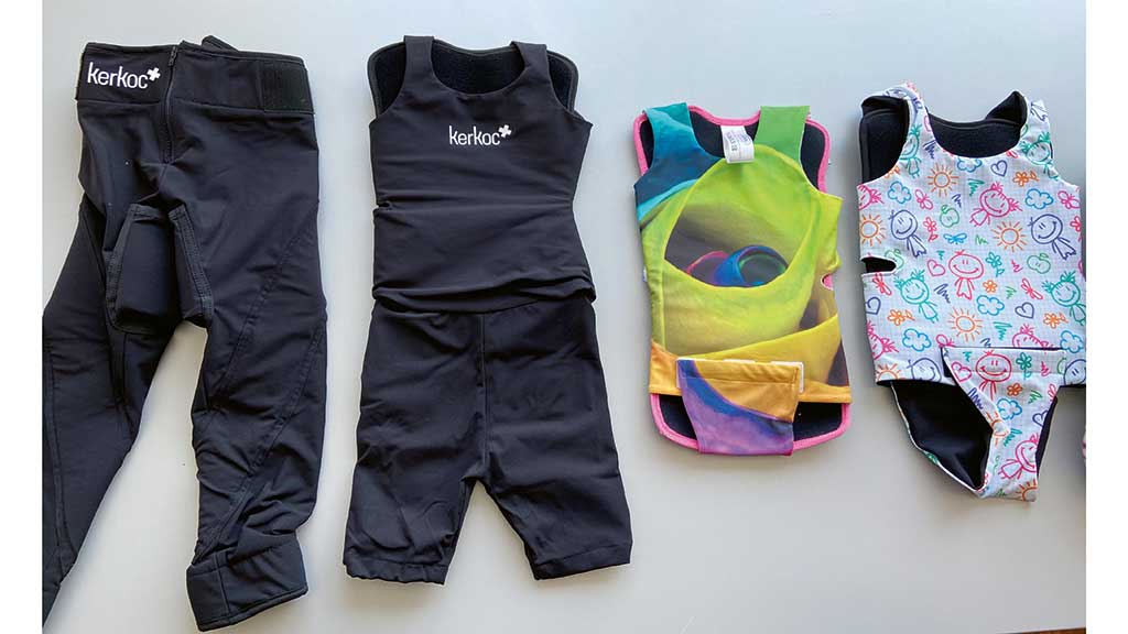 Weiterentwickelt wurden die Korrekturanzüge als elastische, hauteng anliegende Ganzkörper-Kompressionsorthesen für den Rumpf bzw. einzelne Körperteile, wie den Beckengürtel10. Eine Studie zur Rumpforthese „Spio“ („Stabilizing Pressure Input Orthosis“) zeigte in Kombination mit einer multimodalen ambulanten oder stationären Behandlung Verbesserungen von kyphotischen Fehlhaltungen, aber nicht von Skoliosen und Hüftluxationen11. Ähnlich aufgebaut sind die am Markt erhältlichen Kompressionsorthesen, wie beispielsweise die „Dynamic GPS Soft-Orthese“, „Flexa Barbieri SLR-Orthese“ und „Protheseus TLSO Weste“ (Abb. 3).