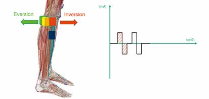 Mit der FES wird dem Patienten bei der zentral bedingten Fußheberschwäche die verlorengegangene Anhebung des Fußes während der Schwungphase wieder ermöglicht und somit das Sturzrisiko reduziert. Eine mögliche Elektrodenanlage besteht dabei am M. tibialis anterior und am N. peroneus communis. Funktionell bewirkt die Stimulation am Fuß eine Dorsalextension, die je nach Elektrodenplatzierung sowohl von einer Vorfußabduktion als auch von einer Pronation begleitet werden kann. Die Stärke der einzelnen Stimulationen wird durch die Elektrodenanlage und durch die Frequenz, die Reizstromstärke und das Timing des Fußhebersignals beeinflusst. Dies geschieht gangphasenadaptiert in der Schwungphase und bei Bedarf auch in der Standphase.